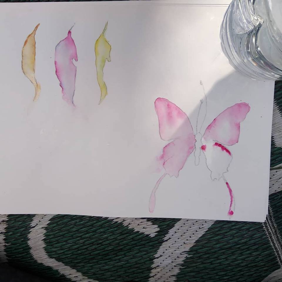 The waterfall brought joy and play as we embraced the cold water, searched for water bugs and living things along the creek beds. We were even graced by the sighting of an endangered Richmond Birdwing Butterfly, after which Birdwings takes its name. It flapped slowly up high and soared on the breezes as high up as the treetops, signaling our return to camp – a challenging route over boulders strewn through the creek bed. This involved moving our bodies in new ways, breathing through the challenge and keeping sight of the end. We arrive and were rewarded with lunchtime and a relaxing afternoon of botanical watercolour painting with our Narell and weaving in the shade with Geira Jen, both artists loving being able to celebrate their creative connections to this place.